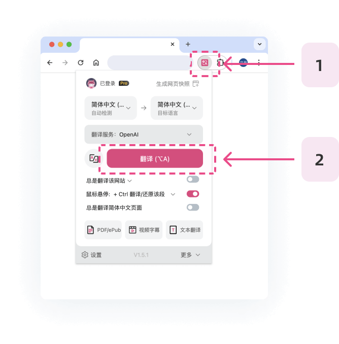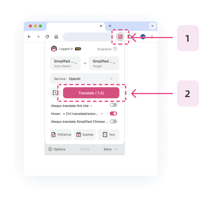 Why pin the icon? Most of the Immersive Translate features require clicking on the extension bar icon. Please refer to the example on the right and continue after pinning the plugin.